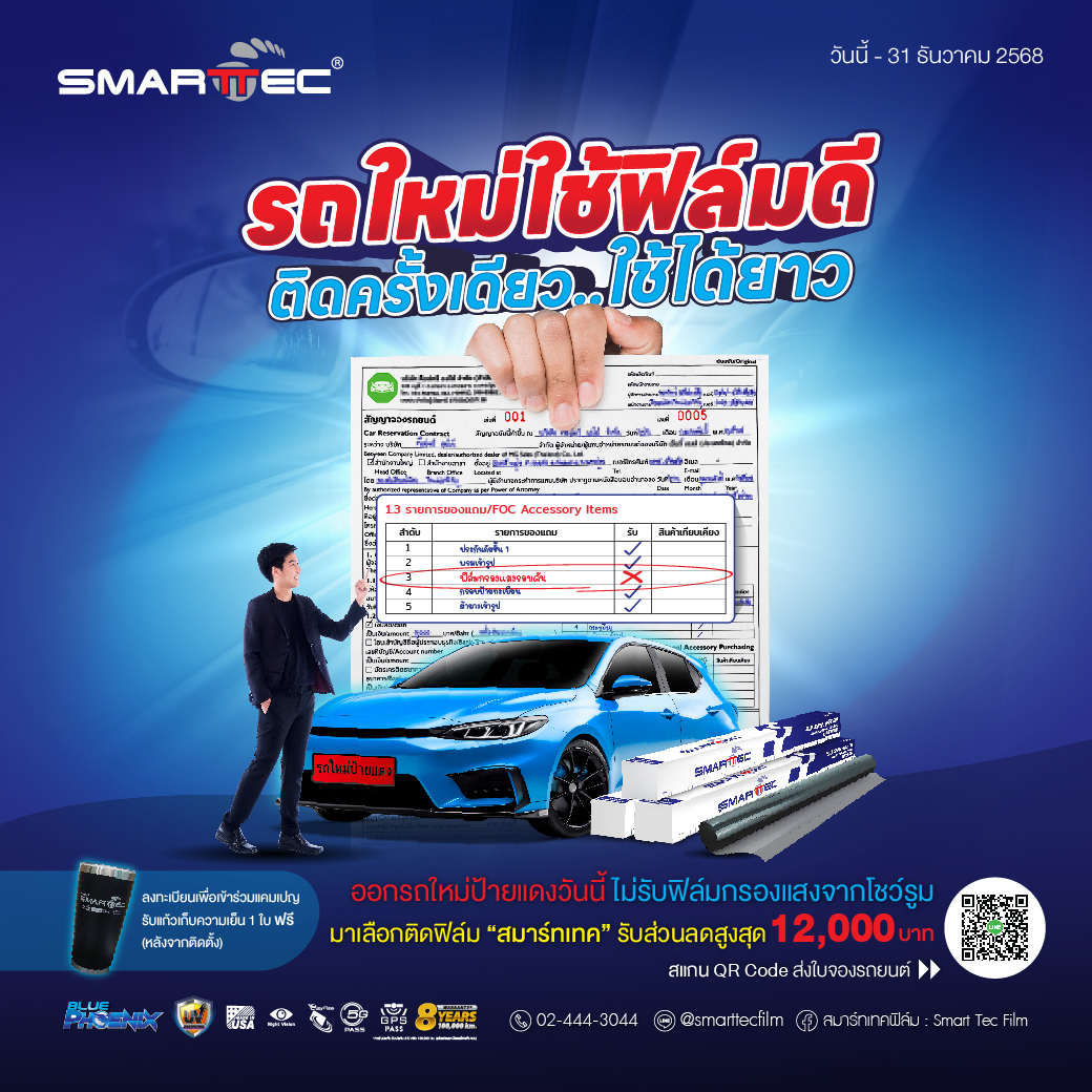 ตอนนี้สมาร์ทเทคมีโปรดีๆ มามอบให้สำหรับลูกค้าที่ออกรถใหม่ แต่ยังไม่ได้ติดฟิล์ม ก็รับส่วนลดติดฟิล์มรุ่นท็อปอย่าง Blue Phoenix ที่ลดสูงสุดถึง 12,000 บาท ไม่ว่าจะเป็นรถใหม่ค่ายไหน รุ่นไหนก็ได้ เพียงแค่ลงทะเบียนเพื่อเข้าร่วมแคมเปญ รับฟรีแก้วน้ำเก็บความเย็น 1 ใบ (ได้รับหลังจากการติดตั้ง) 🌟 ฟิล์มกรองแสงติดรถยนต์ต้องเลือกคุณภาพดี✅ ช่วยลดความร้อนได้จริง✅ ใส เคลียร์ ไม่รบกวนสัญญาณ GPS✅ เพิ่มความเป็นส่วนตัว ขับขี่สบายตลอดทาง