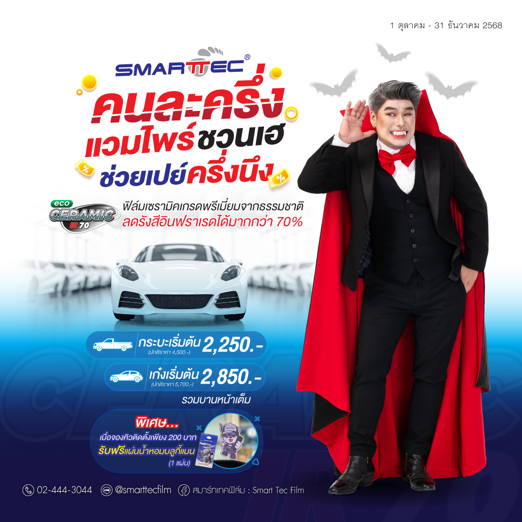 แวมไพร์ไม่ได้มาดูดเลือด แต่มาช่วย “เปย์” ให้ทุกคนแล้ว กับโปรโมชั่น “คนละครึ่ง แวมไพร์ชวนเฮ ช่วยเปย์ครึ่งนึง” ฟิล์มเซรามิคจาก Smart Tec ที่ติดแล้วรถเย็นฉ่ำทันใจ ลดรังสีอินฟราเรดได้มากกว่า 70% มีครบทุกเฉดสีให้เลือก (โดยเฉพาะสีชาในตำนานที่หลายคนถามหา กลับมาแล้ว) โปรแรงแบบนี้พลาดไม่ได้จริง ๆ กระบะ เริ่มต้นเพียง 2,250.- เก๋งเริ่มต้น 2,850.- เท่านั้น พิเศษ…จองติดตั้งผ่าน Inbox เพียง 200.- (รับฟรี : แผ่นน้ำหอมลายบลูกี้แมน 1 แผ่น) ติดฟิล์มทั้งทีได้งานเนี๊ยบ คุณภาพเกินราคา แถมจ่ายแค่ครึ่งเดียว จะรออะไรอยู่ล่ะครับ มีให้เลือก 3 โทนสีสุดจ๊าบ